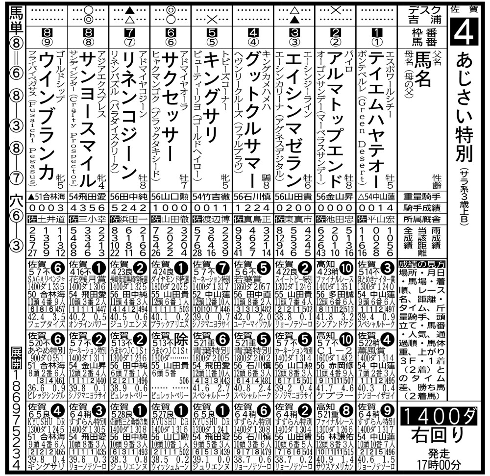 テイエムハヤテオー・平山師 1番枠だし、ハナに立つつもりで。ただ、デキに変化はないけれど、特別に入るとメンバーが強いね。