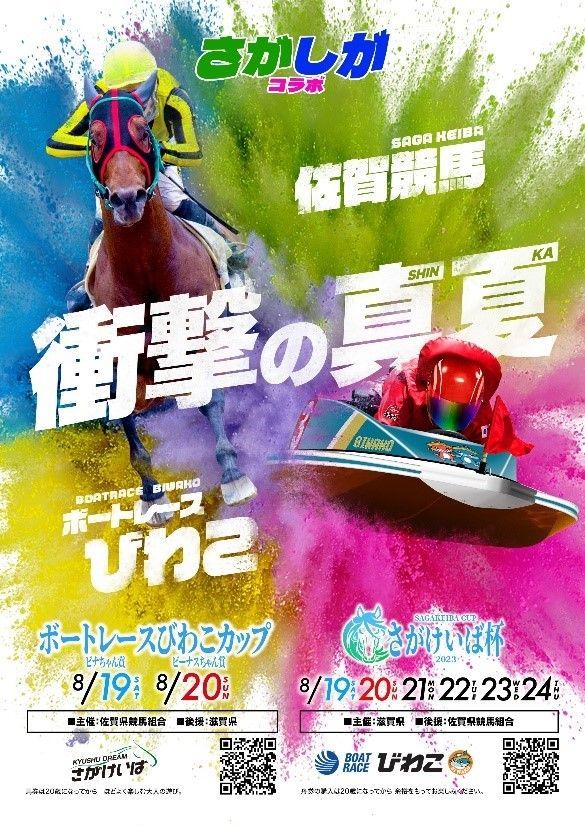 佐賀競馬では、「ボートレースびわこカップ」として、8月19日に「ビナちゃん賞」を、同20日に「ビーナスちゃん賞」を開催。びわこボートでは、8月19~24日に「さがけいば杯」を実施する。