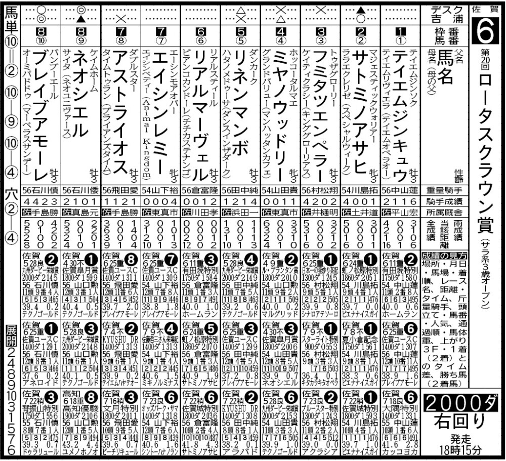 サトミノアサヒが4連勝で一気に頭角を現した。満を持しての重賞初挑戦。JRAでは5戦未勝利も、佐賀へ移籍後、じわじわと結果を出して近走での快進撃だ。距離に不安はなく、先行押し切りを狙う。