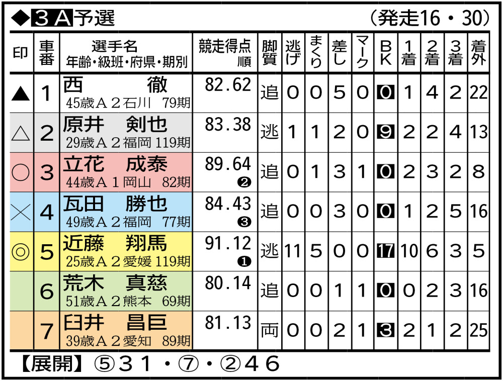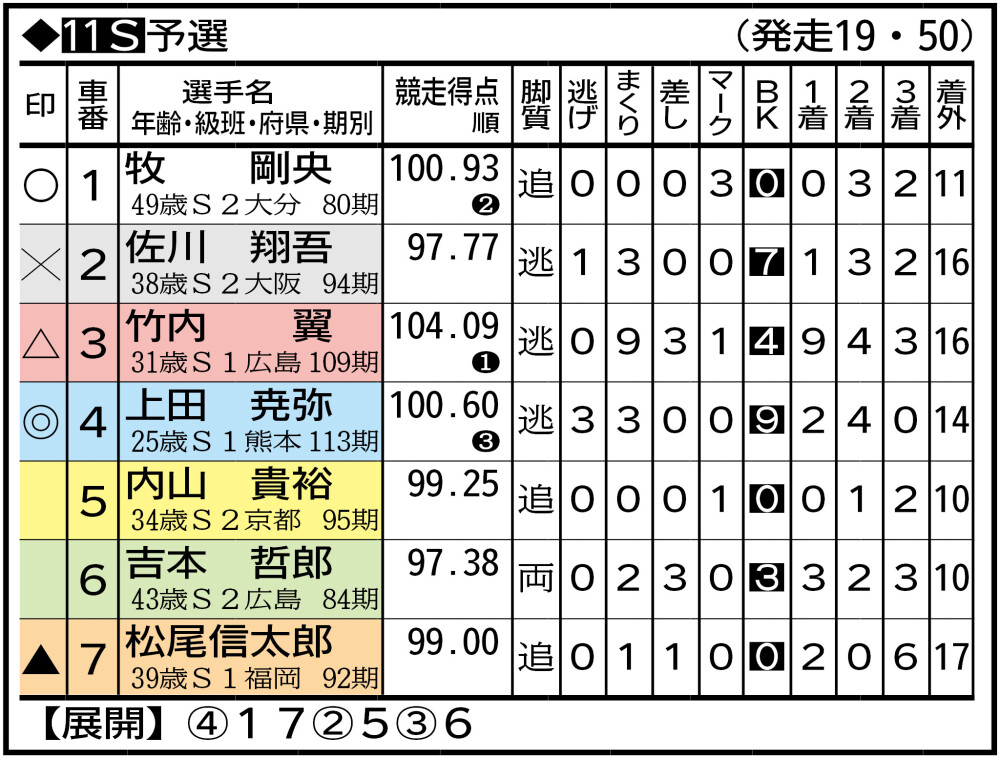 ⑥井山和裕 佐世保646。(前回初日は)3角3番手捲りでワンツーした塩崎隼秀―藤原悠斗を追走。