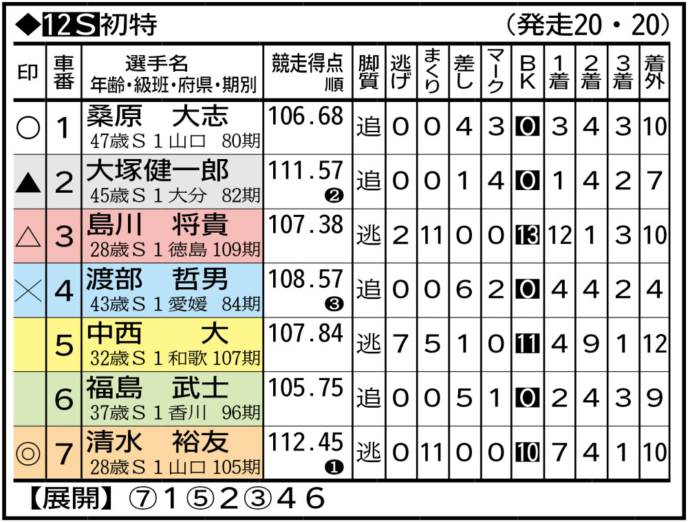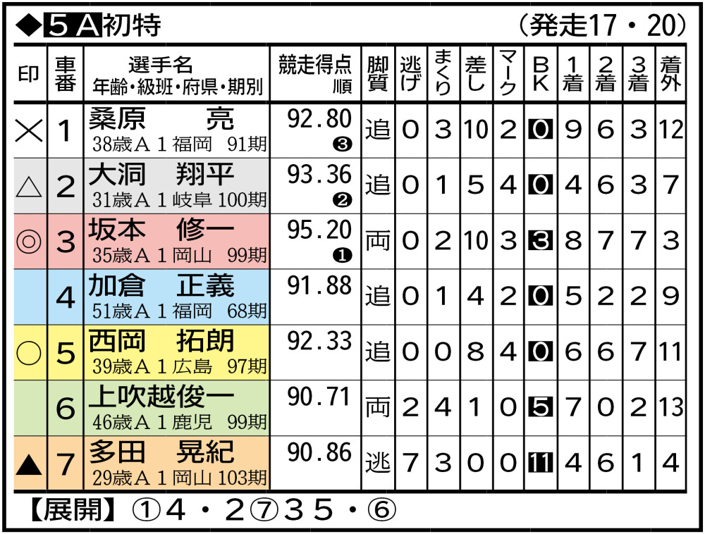 ①桑原亮 佐世保(7)2(5)。(前回3日目は)5番手捲りVの鶴良生を追い切れず。