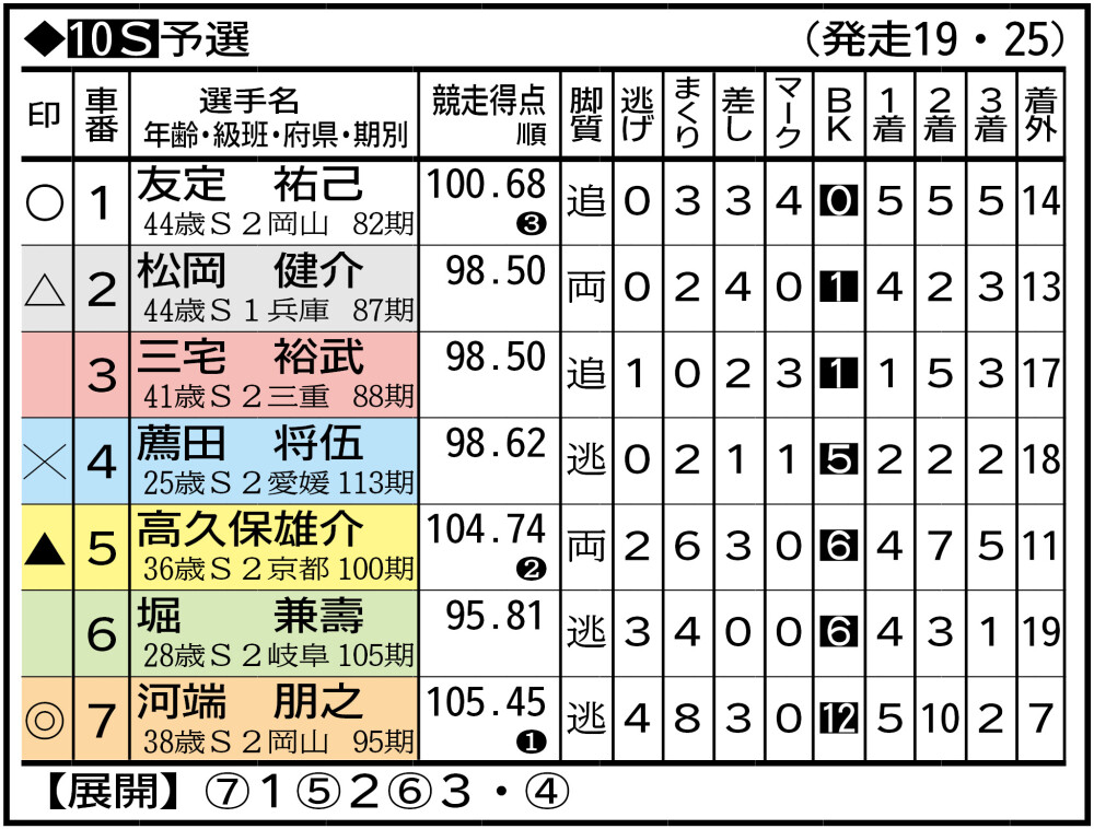 ⑦多田晃紀 小倉12(4)。(前回3日目は)特昇を懸けた単騎の後藤大輝を中団に詰まらせペース逃げし、田中勇二のVに貢献。