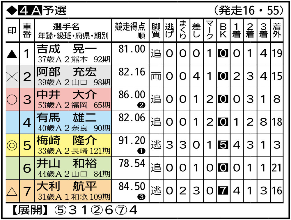 ⑤梅崎隆介 佐世保263。(前回3日目は)HS5番手捲るも蓮井祐輝のけん制、中井勇介の番手発進で苦戦。