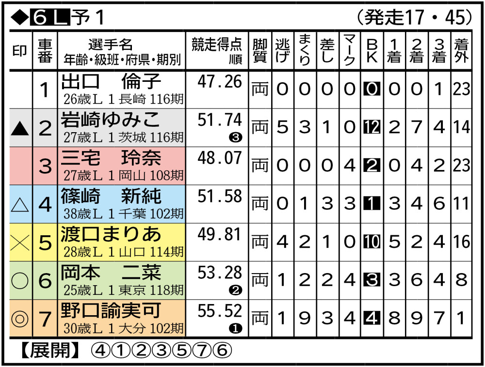 ①出口倫子 小倉負傷欠。前々回65落。最終日に4角6番手で転倒。