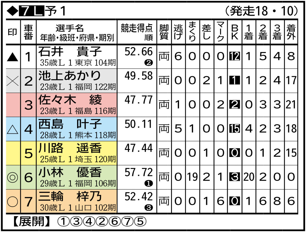 ⑥小林優香 小田原負傷欠(左足首捻挫)。前々回はGコレクション。佐藤水菜が逃げ切りV。尾方真生は3番手捲れず、佐藤追走の児玉碧衣も合わされる。小林は尾方後位の4番手で2着浮上。