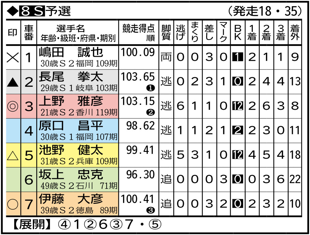 ①嶋田誠也 佐世保616。(前回2日目は)赤板で抑えた脇本勇希の番手で好展開。