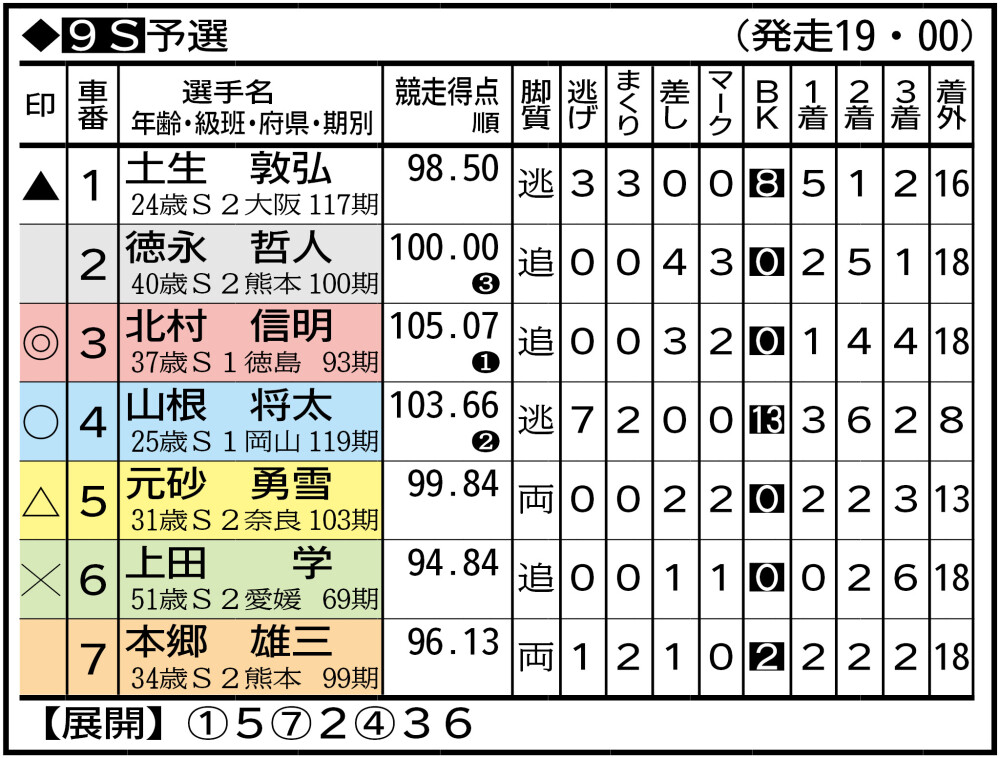 ⑦南部亮太 小倉277。(前回初日は)緒方慎太朗と岩城佑典の踏み合いを捲る。