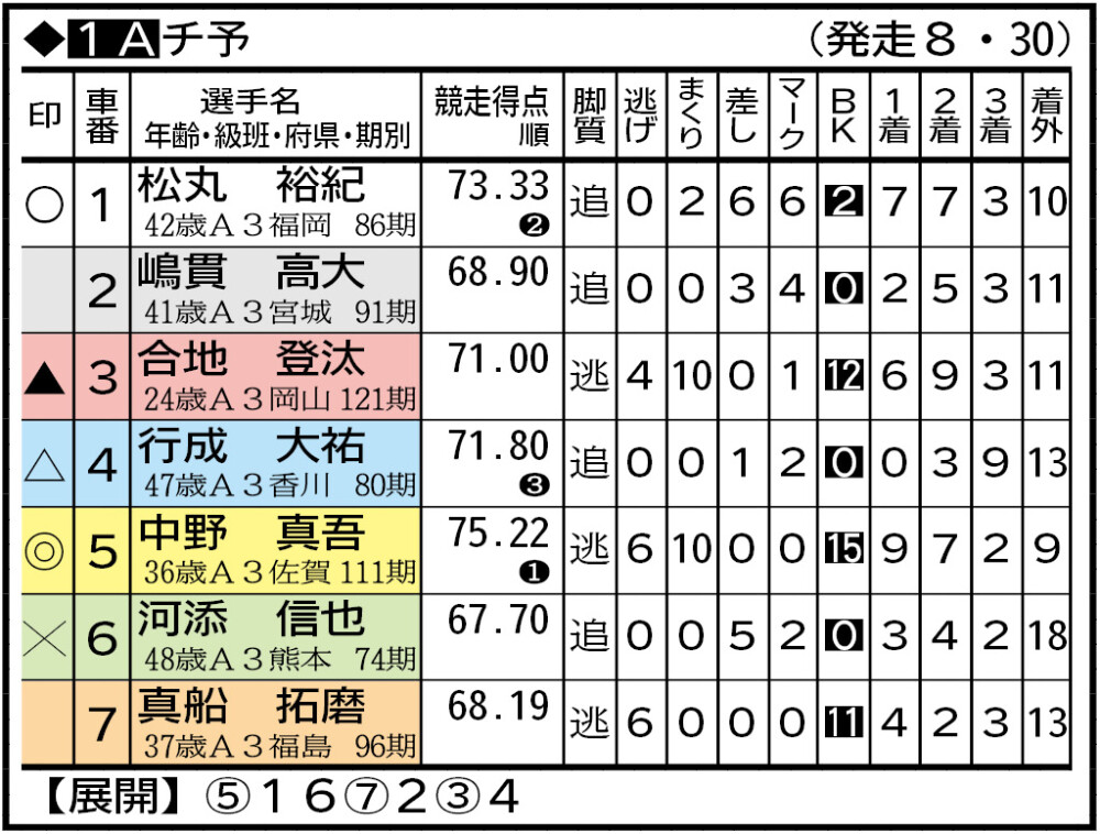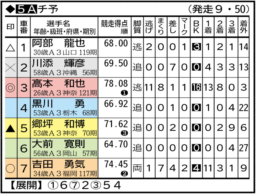 三浦は3車とライン長く調子もまずまず。田代は力をつけてきたが病欠明けで久々なのがやや気がかり。混戦で眞鍋の食い込みも一考。