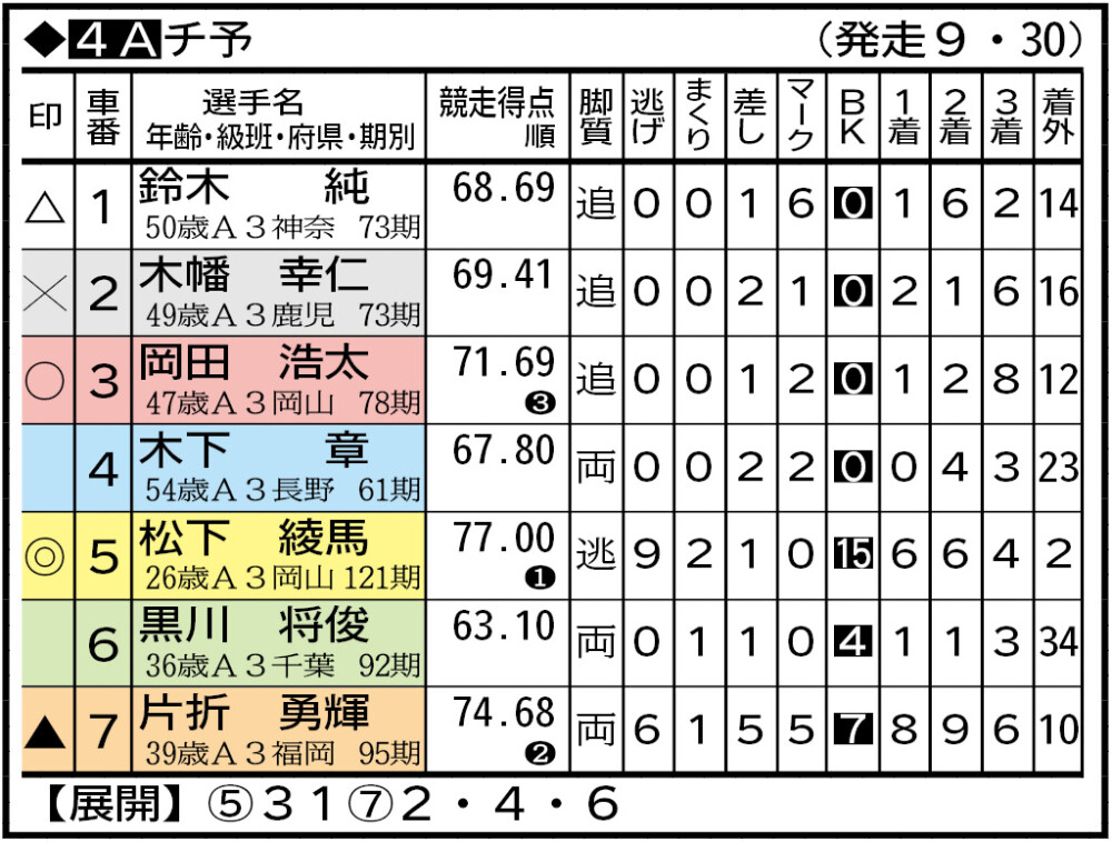 1番車の鈴木がラインに加わって岡山勢が戦いを優位に運べそう。松下と互角の戦いを演じてきた片折は、事故点が多く作戦に制約がありそう。