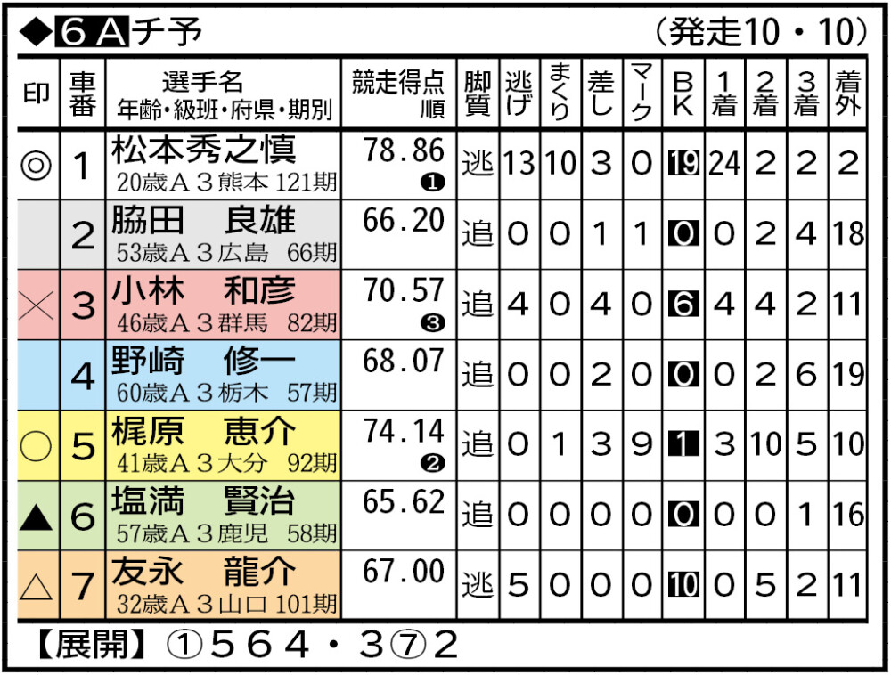 別府競輪のF2モーニング7「第21回トータリゼータ別府杯」が16日、開幕する。朝8時30分、チャレンジ7個レースの熱戦がスタートする。今節は121期の新人が7人参戦。初日は全レースで若々しい新人の走りが見られる。V候補も121期で、堀航輝、高本和也の東日本勢に、岡山の松下綾馬が遠征勢の中心。熊本の松本秀之慎、地元の長松大祐が迎え撃つ。