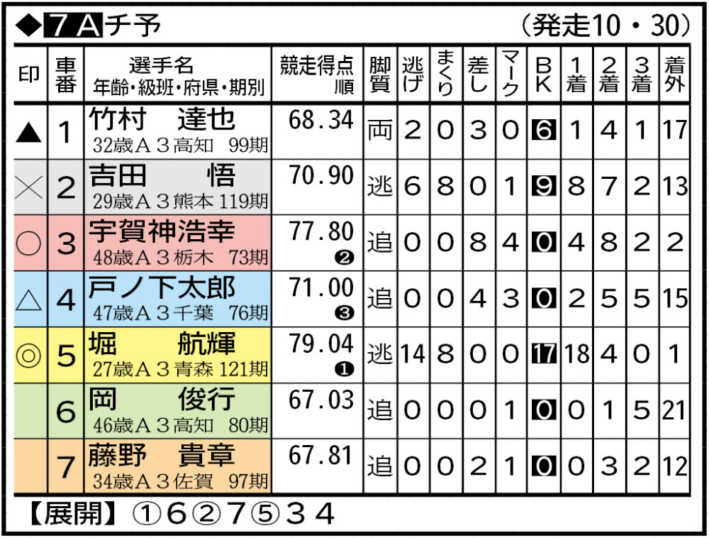 堀が脚力で圧倒する。今年は23走して連を外したのは落車した1走だけ。18勝、2着4回と安定感は抜群だ。ラインも3車と長く、番手が宇賀神なら離れず食らいつけるとみる。ただ、車番がいい竹村が前々に攻めると2着が別線になることも。5―3を厚めに、2着に竹村や吉田を配した車券も少々。