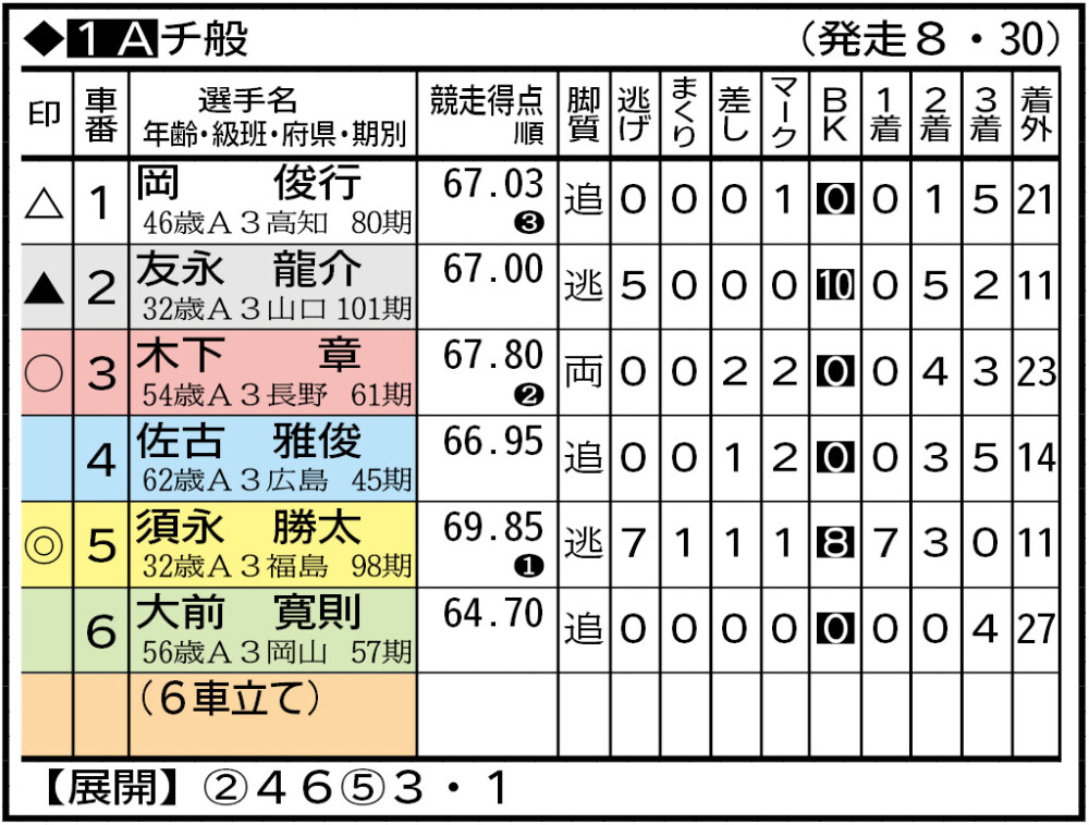 ラインの長い友永から狙う手もあるが、決まり手の多い須永を軸に据えた。大きく狙うなら木下の今年初勝利。