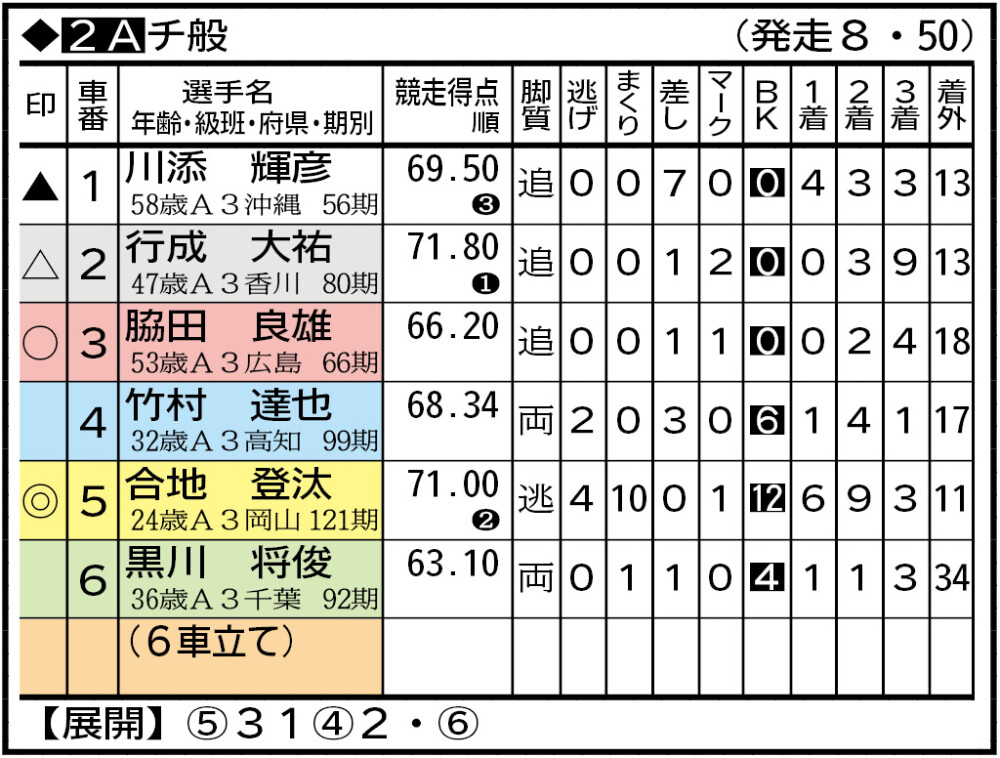 2分戦で中国対四国の様相。竹村は番手勝負が得意だが普段は連係する中国勢に競りかけるのは気持ちが乗らないはず。合地の逃げを脇田が好追。