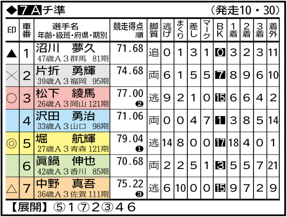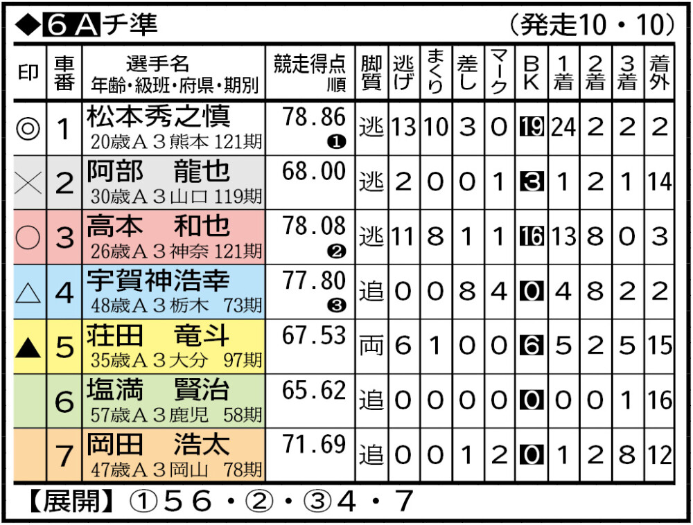 松本は本格デビュー後に決勝を外していない。安定感抜群で1着固定。マークする荘田が食らいつけるかは微妙で、高本との121期ワンツーを中心視。宇賀神、阿部も確定板の圏内。