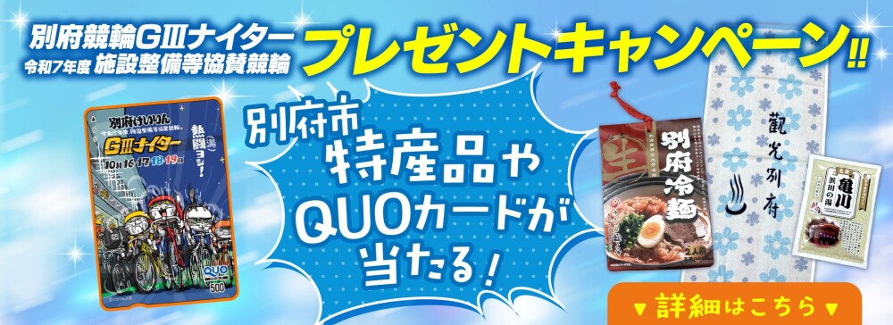 西スポレースサイトでは、別府競輪で16日に開幕する「施設整備等協賛競輪 別府競輪GⅢナイター」(19日まで)の開催を記念して、別府特産品や特製クオカードなどのグッズプレゼントを実施する。