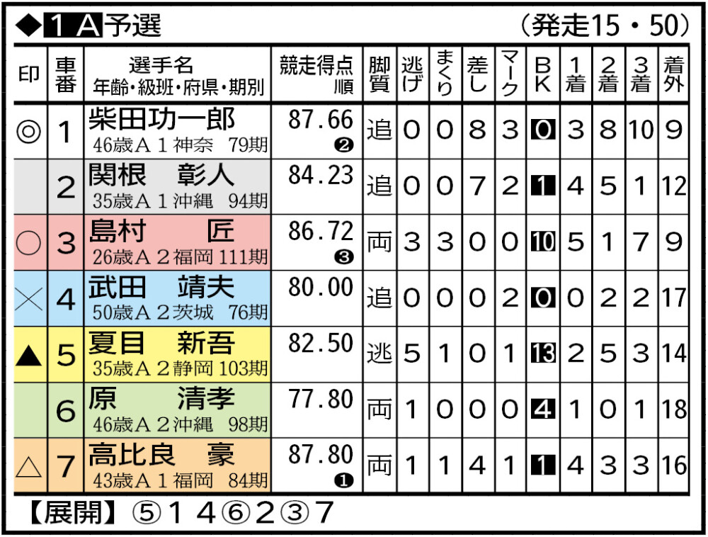 夏目の先制で展開は柴田。島村は車番が悪く対抗評価も、自力脚は最上位なだけに高比良とのワンツーは十分だ。