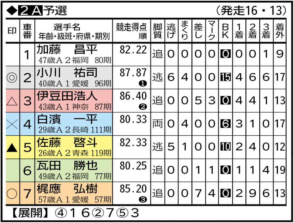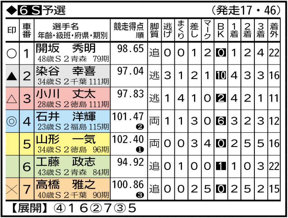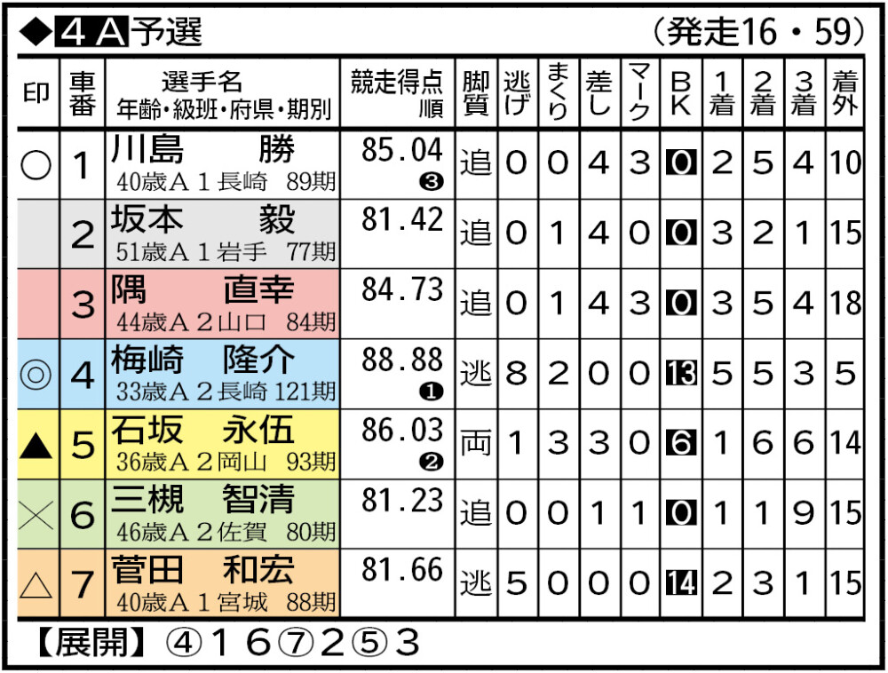 梅崎が後ろの先輩2車を連れ込む。良化中の川島なら差し目も一考したい。石坂の浮上は、菅田が梅崎に猛抵抗すればが条件。
