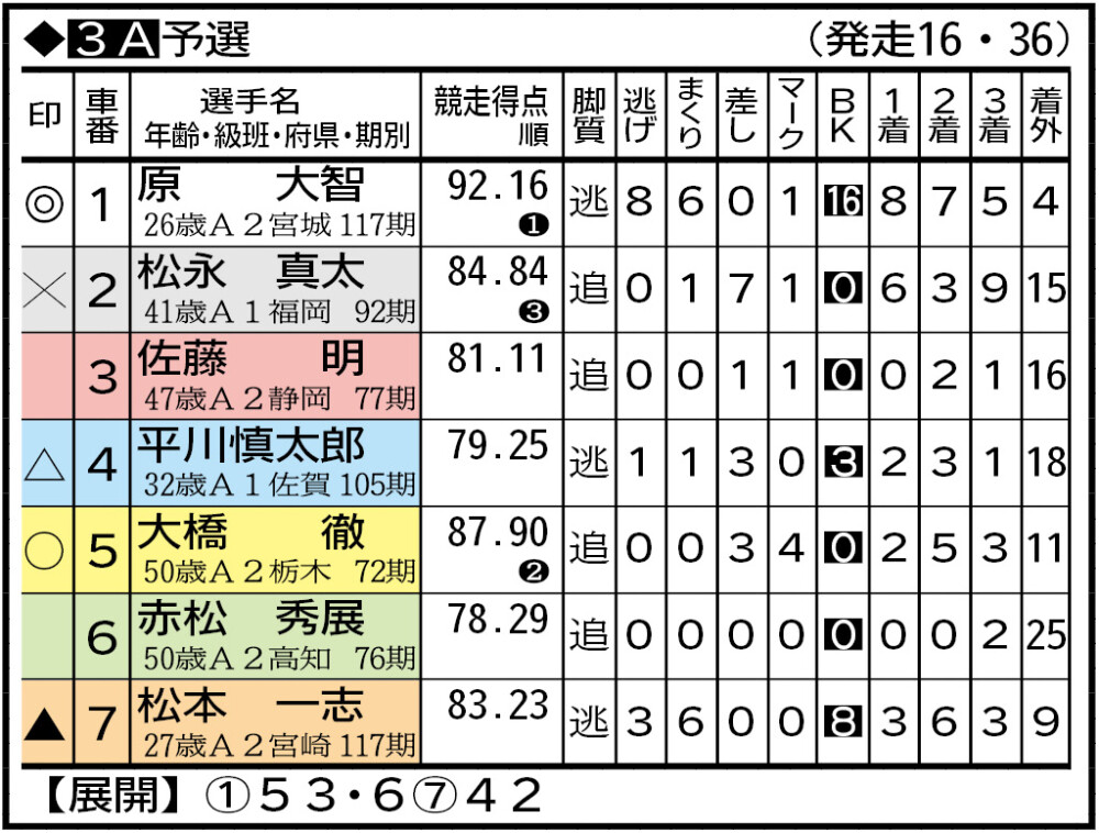 原はS級点を考えると成績は落とせないので一戦一戦が勝負。捲りになると大橋はついて行けない可能性も少々ある。
