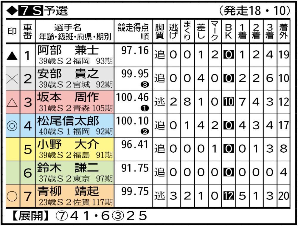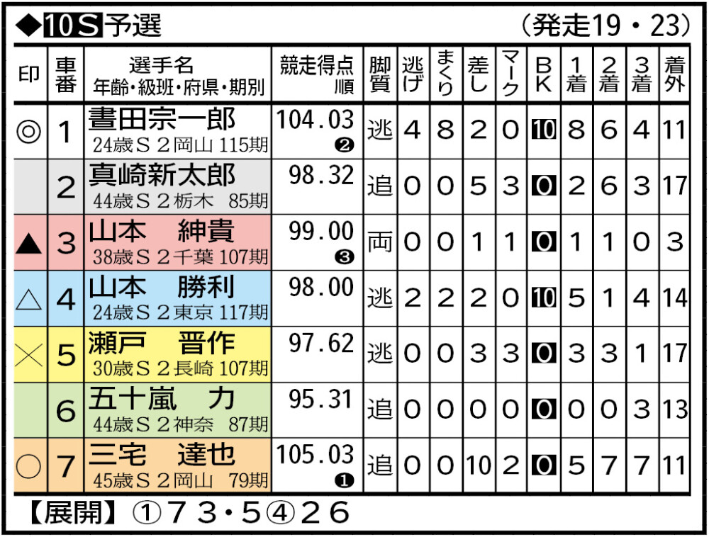 練習強化で力をつけた晝田が本命。三宅は前回最終日に晝田の番手で3着(1着は晝田)。山本紳は追い込みスタイルに変わりたい様子。