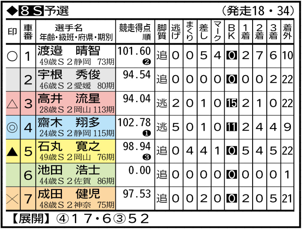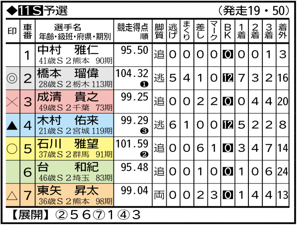 躍動中の齋木が同県のG1ウイナー渡邉をけん引。石丸は高井を番手捲りすればだが、初日からそこまではやらないか。