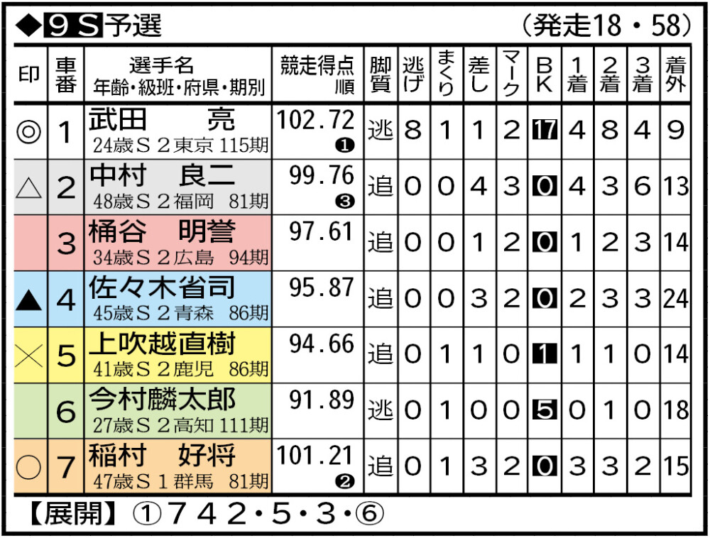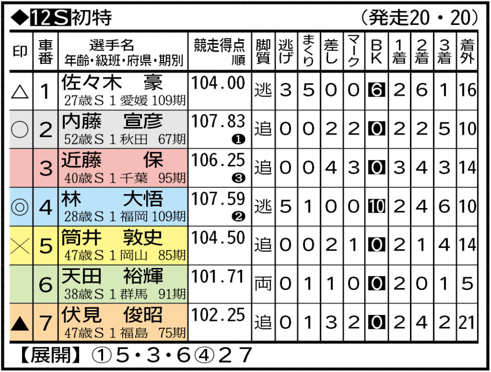 ビッグレース実績も豊富な佐々木は「3、4回くらい林君と対戦しているけど、一度も勝っていない。自分と走るときは112点くらいの強豪選手になる」と苦笑い。それなら現在の競走得点を信頼して林から狙う。ベテラン内藤がG前で迫ってマッチレース。3番手の伏見は成績ほど状態は悪くない。
