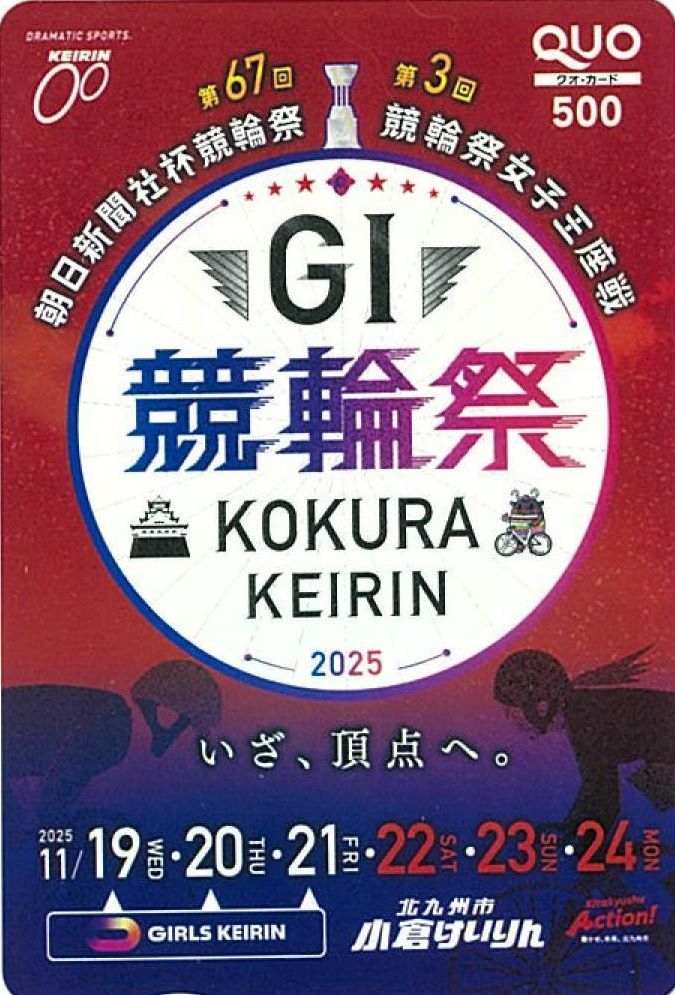 小倉競輪は、GⅠ「第67回競輪祭」(19~24日)とGⅠ「第3回競輪祭女子王座戦」(19~21日)の開催を記念して、オリジナルクオカード(500円分)=写真=を西スポレースサイト読者10人にプレゼントする。