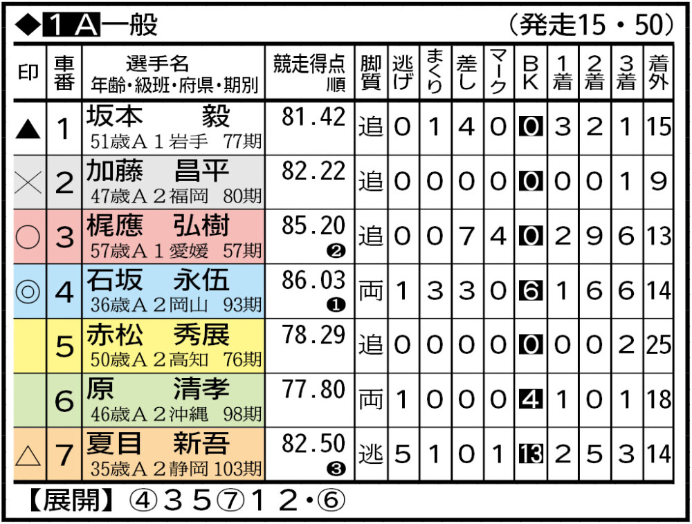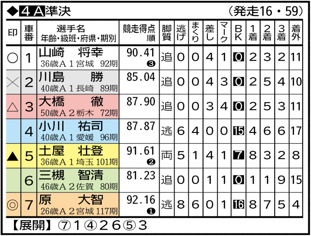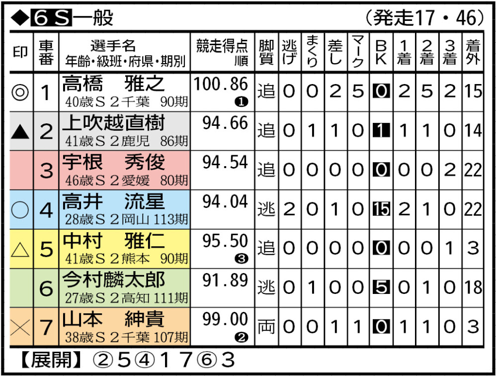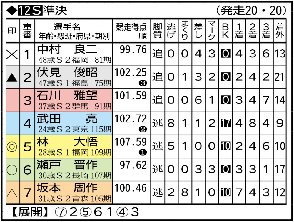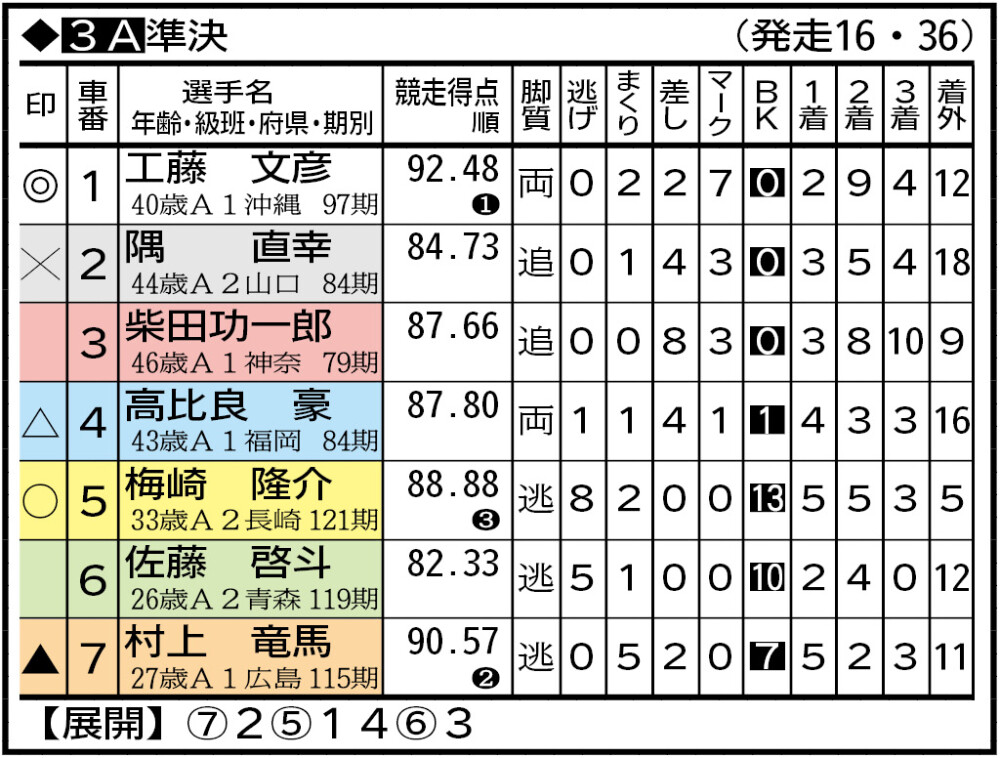 初日に主導権を取れずに危うかった梅崎は、準決こそはシンプルに駆けたいはず。工藤が恵まれる。村上が捲って九州勢に食い込む。
