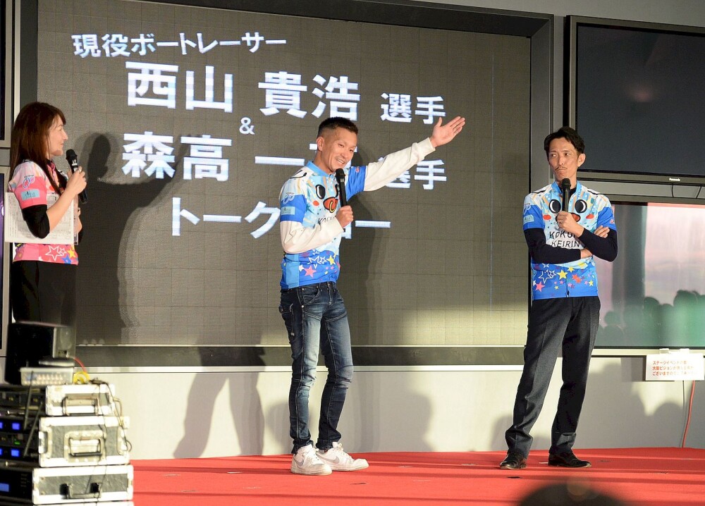 競輪祭4日目の5R発売中に、ボートレーサーの西山貴浩(38)=福岡・97期・A1=と森高一真(47)=香川・85期・A1=がトークショーを行った。