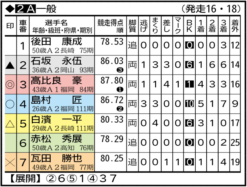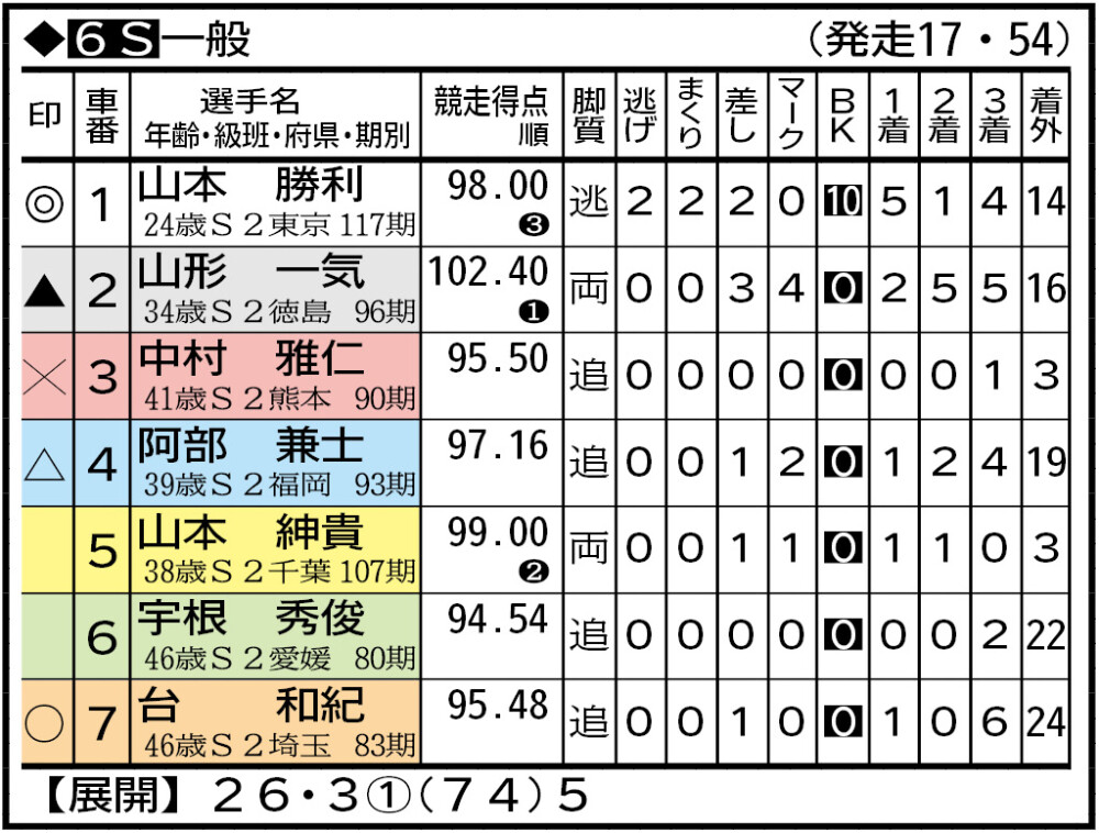 山本勝の先行一車で焦点は次位争い。番手は初手から競りだが、ラインの台に意地がある。山形も好位狙いだろう。宇根が3着の穴。