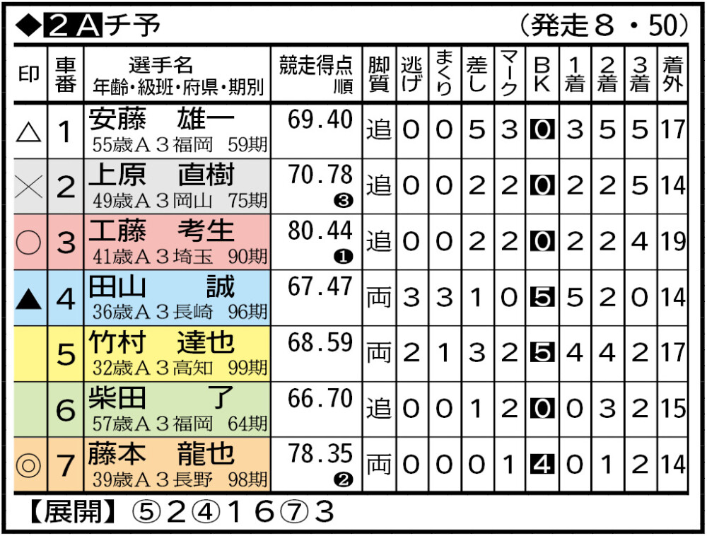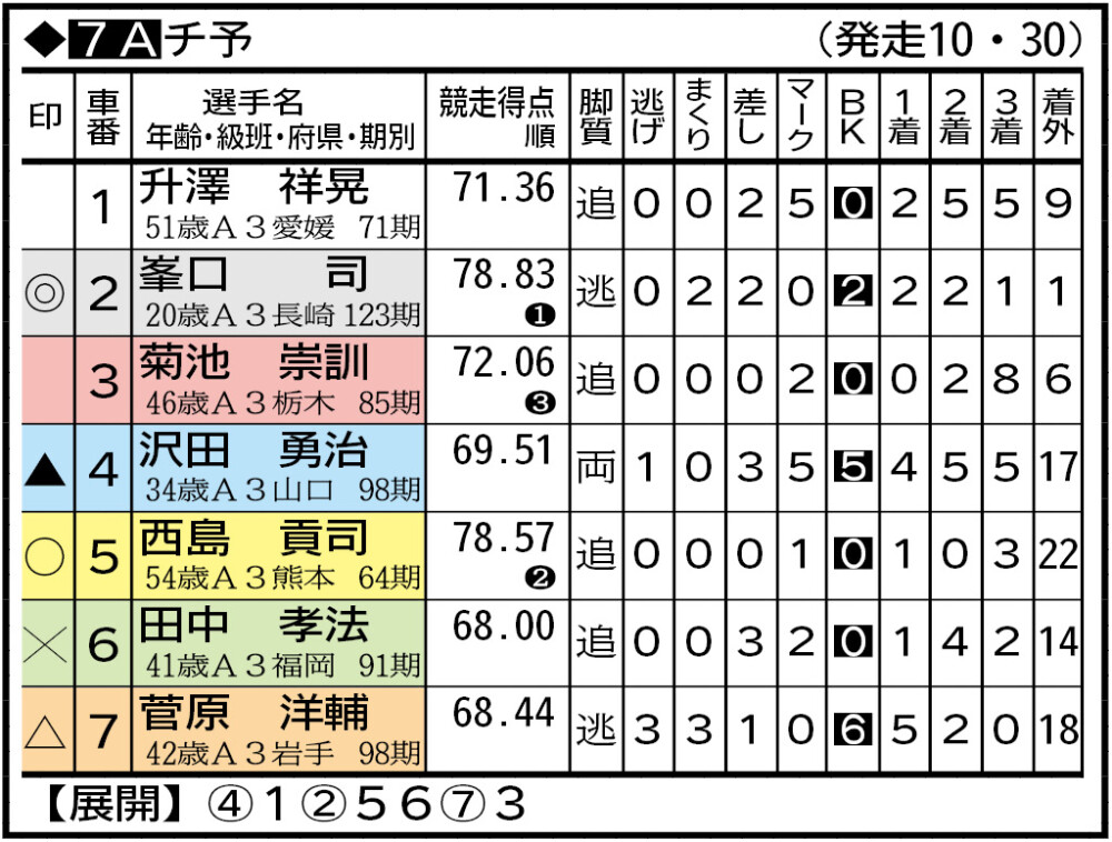 F2のモーニング7が15日に開幕する。今節は123期のルーキーが5人参戦。前評判通りならV争いは地元・峯口司と佐藤壮志のマッチレースが濃厚で、両者の激走から目が離せない。シリーズリーダー(最高得点者)は南関のベテラン會田正一。今期は無念のA3落ちだが、新人相手に往年の鋭敏な差し脚を披露する。