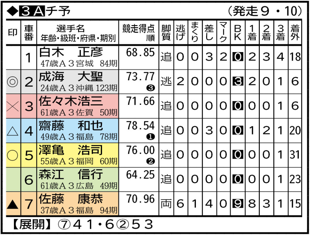 123期の成海は既に1場所を消化(武雄で5、1、1着)。今回はもっと上向きそうで本命に推せる。