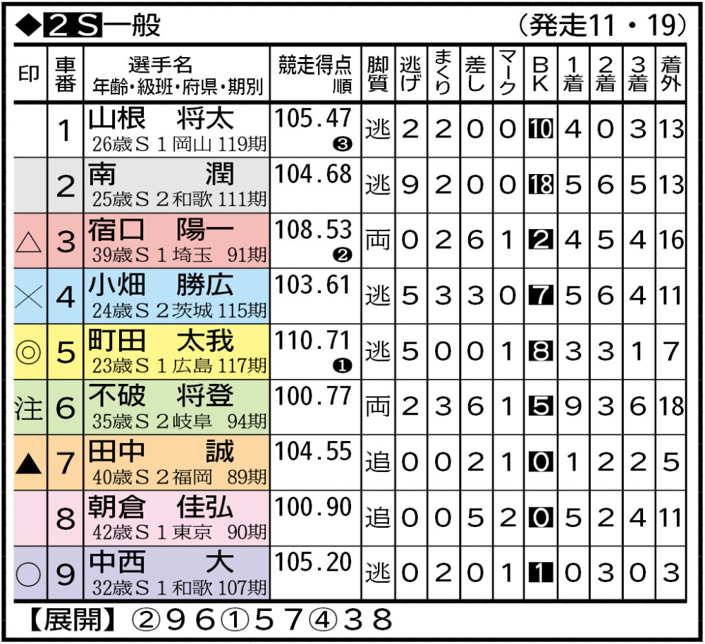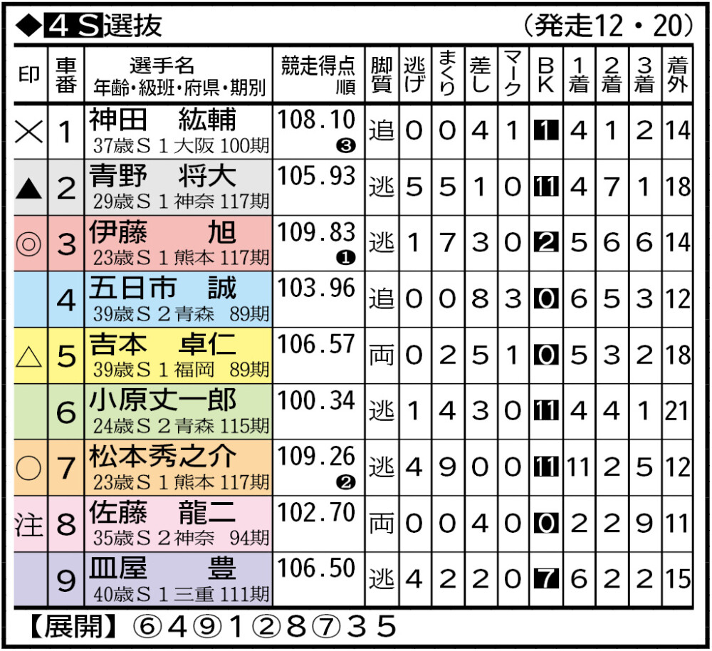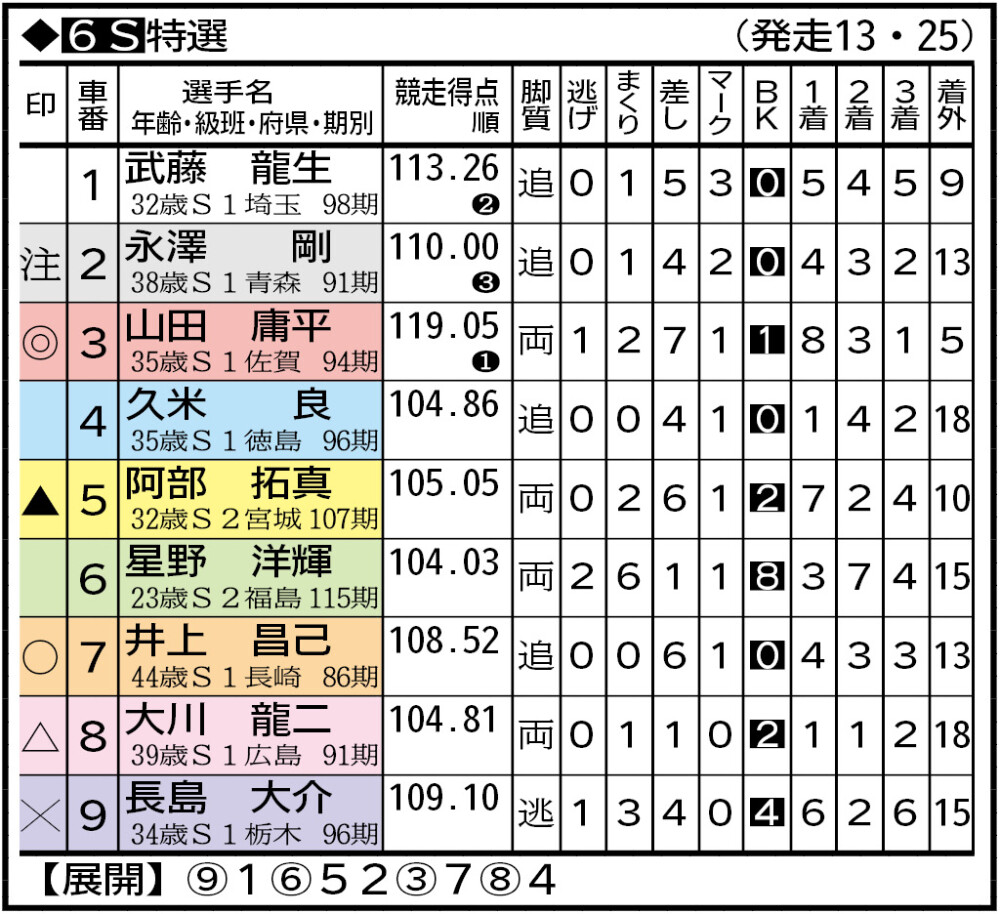 山田は今回参加メンバーでは帰郷した古性に次ぐ高得点。自力でも強いところを最後に示す。星野後位から阿部が抜け出して今節2勝目を狙う。