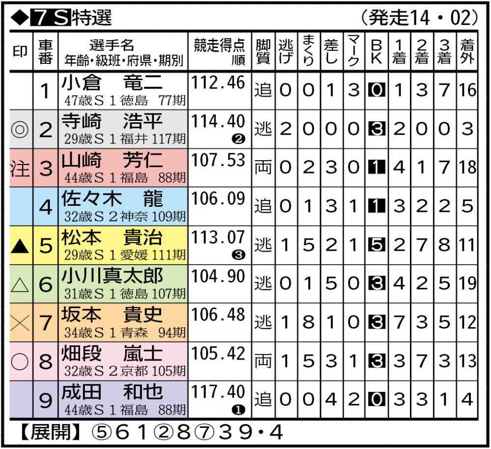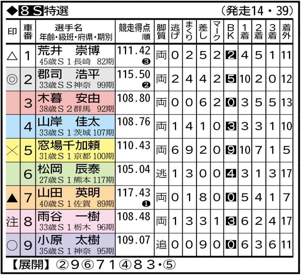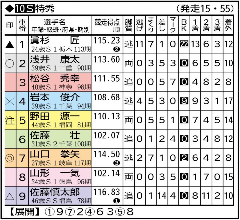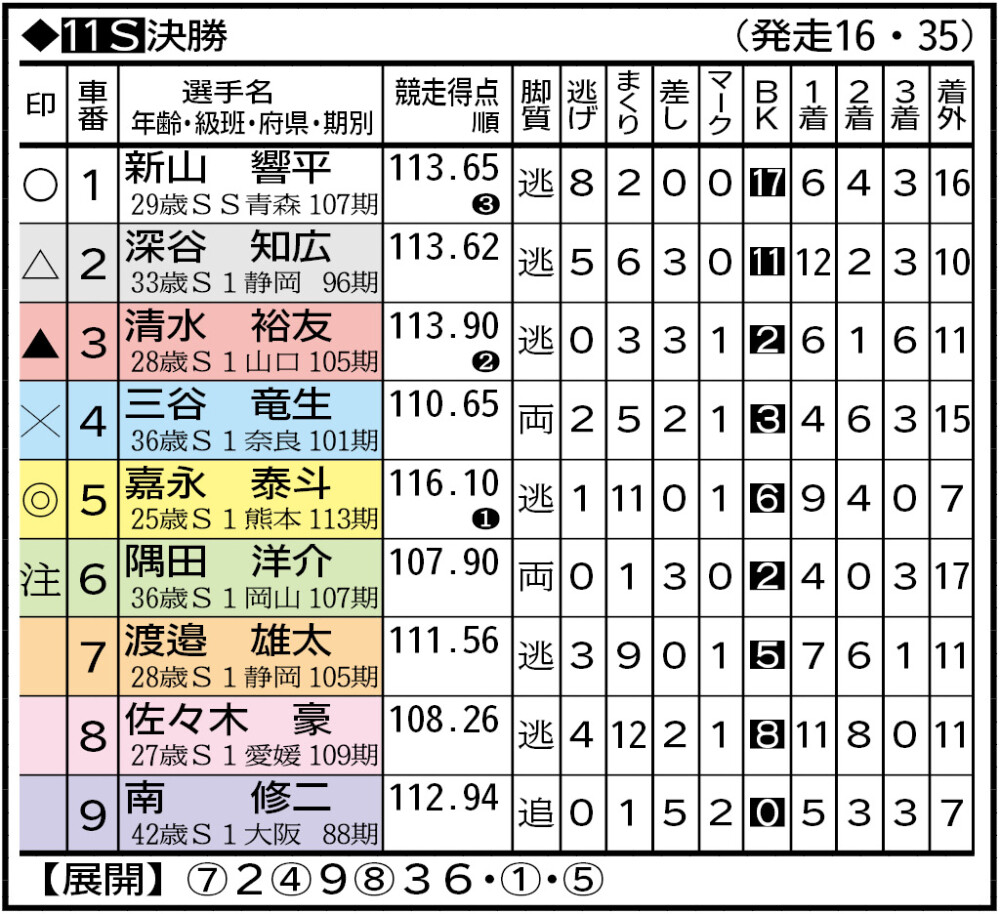 1、新山響平 前を取っての突っ張り先行は作戦通り。後ろは成田さんだし、3番手に稲川さんが入ったことも確認できた。みんな攻めづらいと思った。最後は抜かれているので、もっと強弱をつければ外は伸びづらかったと思う。状態面に不安はない。単騎で自力。