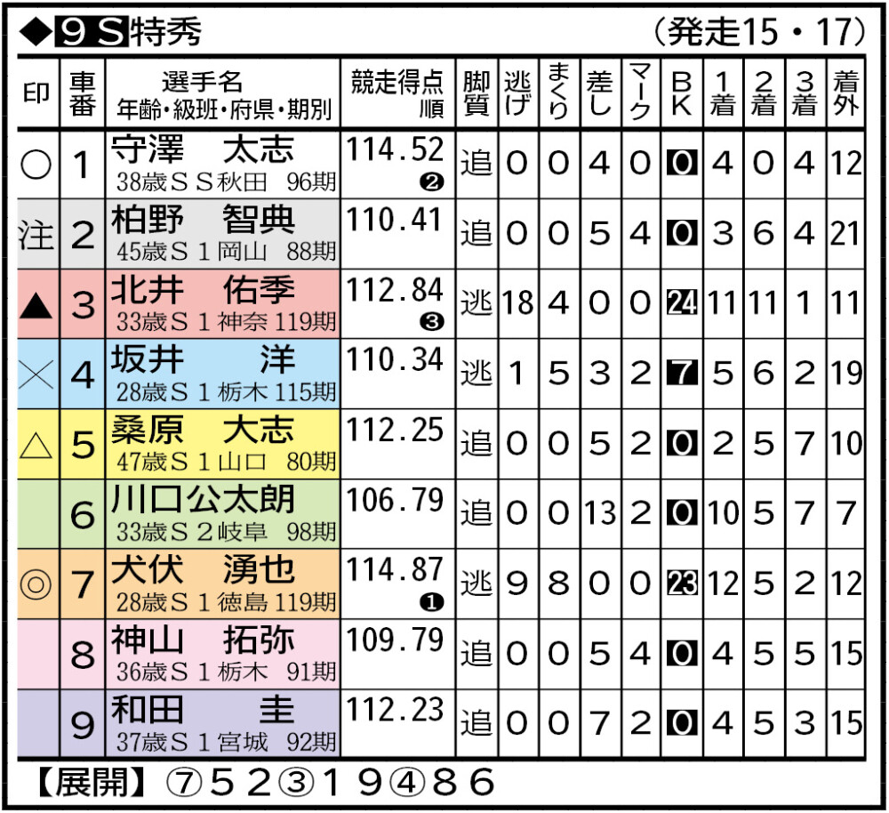 北井が相手なら犬伏は豪快にカマす。初日はマークできた桑原だが離れてしまうことも。その場合は北井が追いかけて守澤とワンツーへ。もがき合いなら坂井が一撃。