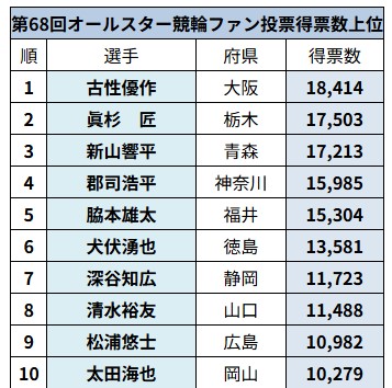 【競輪】ガールズ賞金順位表 8月10日、女子オールスター終了時点