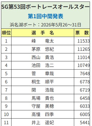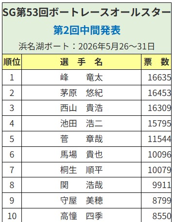 【ボートレース】SG第53回ボートレースオールスター ファン投票 第2回中間発表【表】